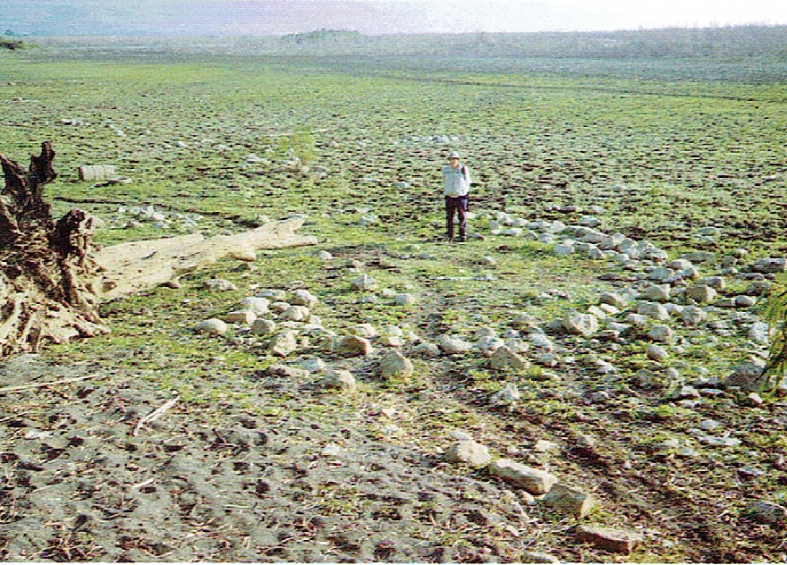 A man standing within what appears to be the foundation of a round tower at the edge of the Sea of Galilee. These el-Araj ruins are under water except during the lake’s periods of low water. (Photo courtesy of Janet Frankovic)