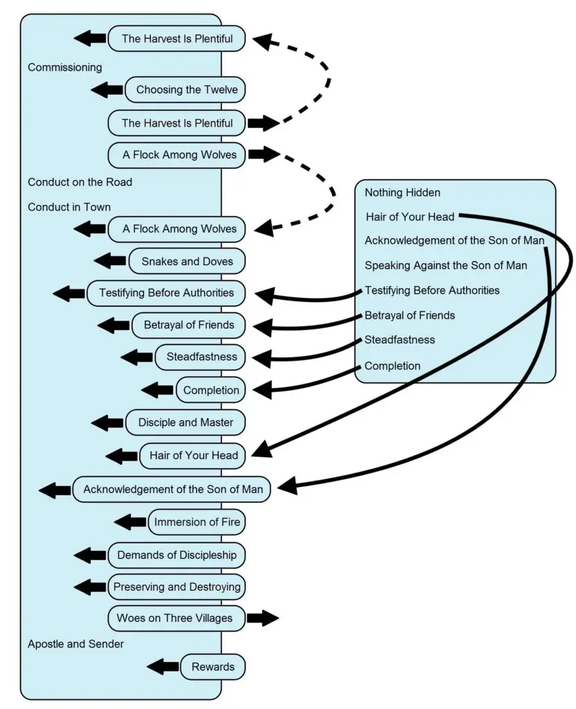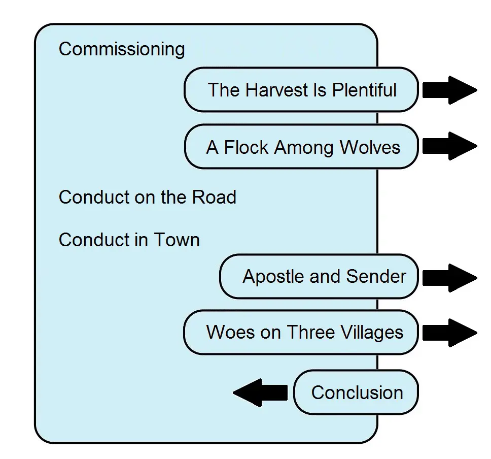 During the stages of transmission from the conjectured Hebrew Life of Yeshua to the Synoptic Gospels the full account of the instructions Jesus gave to his apostles was subjected to various changes. It appears that the Anthologizer kept the material pertaining to the Mission of the Twelve from the Commissioning to the conclusion of Jesus instructions intact. To the end of this block of material the Anthologizer attached the Woes on Three Villages, which was similar in form and content to the instructions regarding how the apostles were to deal with a village that failed to show them hospitality. The First Reconstructor, a Greek epitomizer and stylistic polisher, gave a bare-bones version of Jesus’ instructions to the Twelve. He retained the Commissioning scene, but removed the more picturesque sections such as “The Harvest Is Plentiful” and “A Flock Among Wolves” as well as Apostle and Sender. The First Reconstructor also removed Woes on Three Villages, realizing that these woes were not an integral part of Jesus’ instructions to the Twelve. Finally, the First Reconstructor supplied a concluding statment describing the apostles’ departure.