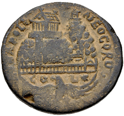 A third-century C.E. coin minted in Neapolis (modern Nablus) depicts Mount Gerizim with a colonnade and stairway leading up to a temple of Zeus built ca. 130 C.E. by Emperor Hadrian. To the right of the temple on a higher elevation is another structure that some scholars have identified as an altar or a synagogue of the Samaritans. Image courtesy of the Classical Numismatic Group.