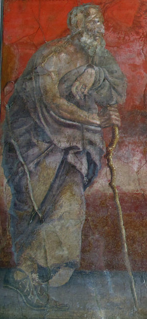 First-century B.C.E. or first-century C.E. fresco from Villa Farnesina in Rome depicting the itinerant Cynic philosopher Crates (Κράτης, Kratēs) laden with a pack on his shoulders, carrying a staff in his right hand and holding the strap of his luggage in his left, and wearing sandals on his feet. The philosopher is wearing an animal skin cloak that covers a χιτών (chitōn, “tunic”) that reaches to just above his knees. (See Gisela M. A. Richter, The Portraits of the Greeks [3 vols.; London: Phaidon, 1965], 2:186.) Unlike this philosopher, the twelve apostles were sent on their mission without any travel gear whatsoever. Photo courtesy of Wikimedia Commons.