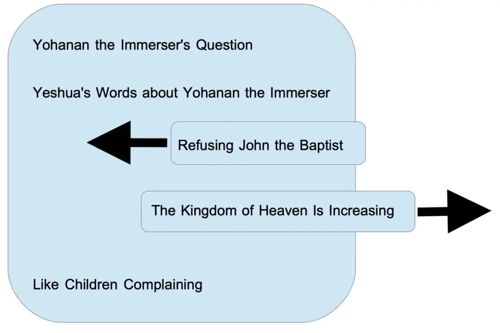 In the Anthology, The Kingdom of Heaven Is Increasing likely belonged to the remnant of an original narrative-sayings “complex” that existed in the Hebrew Life of Yeshua and its Greek Translation, in which the incident of the question from the Baptist’s disciples (Yohanan the Immerser’s Question) prompted a teaching discourse from Jesus (Yeshua’s Words About Yohanan the Immerser and The Kingdom of Heaven Is Increasing), which concluded with supporting illustrations (the Mustard Seed and Starter Dough parables). The original contours of this narrative-sayings “complex” began to break down when the Anthologizer removed the twin parables to a different section of his proto-Gospel and tacked Like Children Complaining to the end of this block of John the Baptist material.
