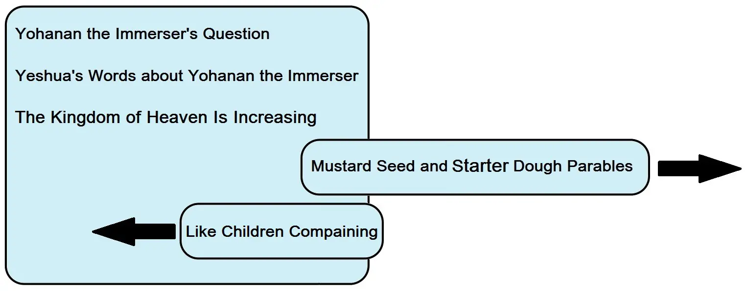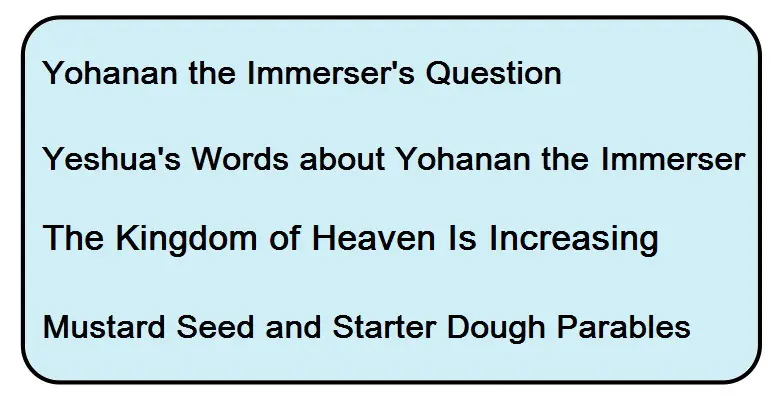| Yohanan the Immerser’s Question ・ Yeshua’s Words About Yohanan the Immerser ・ The Kingdom of Heaven Is Increasing ・ Mustard Seed and Starter Dough parables |