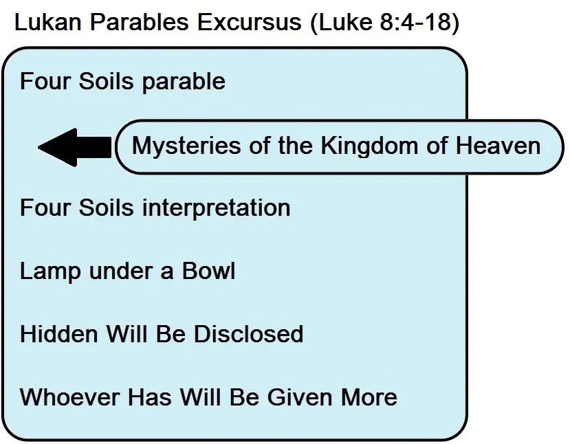 Luke’s treatment of the Four Soils parable inspired the author of Mark to create his parables excursus. As we have discussed elsewhere,[7] the author of Luke injected the Mysteries of the Kingdom of Heaven saying into the discussion of the Four Soils parable, thereby transforming Mysteries of the Kingdom of Heaven into a rationale for Jesus’ use of story parables when teaching in public. Following the Four Soils interpretation the author of Luke added a string of sayings (Luke 8:16-18) from the First Reconstruction (FR) about revelation and listening. The author of Mark, building upon this foundation, added a few more sayings (Mark 4:23-24) parallel to the FR collection in Luke, and proceeded to insert the Spontaneous Growth parable (Mark 4:26-29) and the Mustard Seed parable (Mark 4:30-32). Finally, the author of Mark provided a summary statement explaining that Jesus never spoke to the crowds except in parables, while to disciples Jesus gave clearer explanations (Mark 4:33-34). It is likely that the author of Mark omitted the Starter Dough parable because it did not include the imagery of seeds and sowing and growth, which characterize the other parables in his parables excursus.