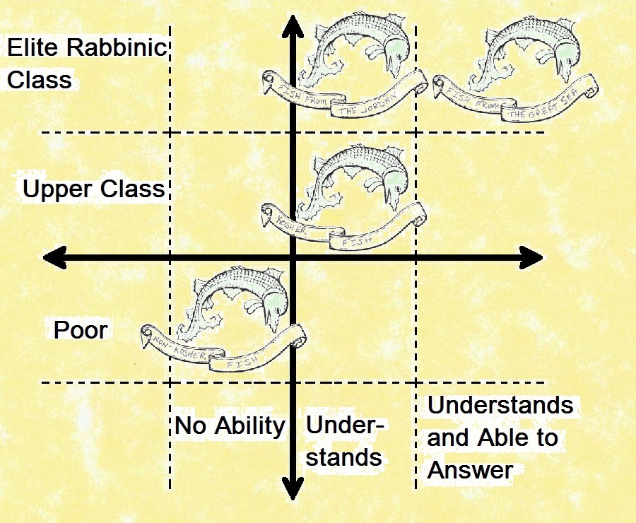 - [11] The key to understanding Rabban Gamliel’s fish metaphor is knowing that he evaluated disciples along two axes: socio-economic status (poor vs. rich) and ability (understanding and ability to answer). Thus, the four types of fish can be plotted on a diagram as follows: