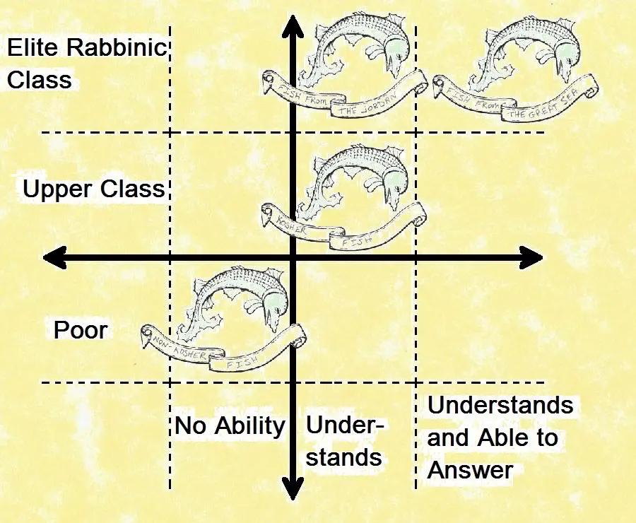 Rabban Gamliel the elder[12] expounded four things on the subject of disciples: a non-kosher fish, a kosher fish, a fish from the Jordan, and a fish from the great sea [i.e., the Mediterranean—DNB and JNT]. A non-kosher fish—how so? A son of poor people who studied Scripture and Mishnah, halachah and aggadah, but he has no understanding. A kosher fish—how so? This is a son of rich people who studied Scripture and Mishnah, halachah and aggadah, and he has understanding. A fish from the Jordan—how so? This is the disciple of a sage who studied Scripture and Mishnah, exegesis, halachah and aggadah, but he does not understand enough to answer. A fish from the great sea—how so? This is the disciple of a sage who studied Scripture and Mishnah, exegesis, halachah and aggadah, and he understands enough to answer. (Avot de-Rabbi Natan, Version A, 40:6 [ed. Schechter, 127])