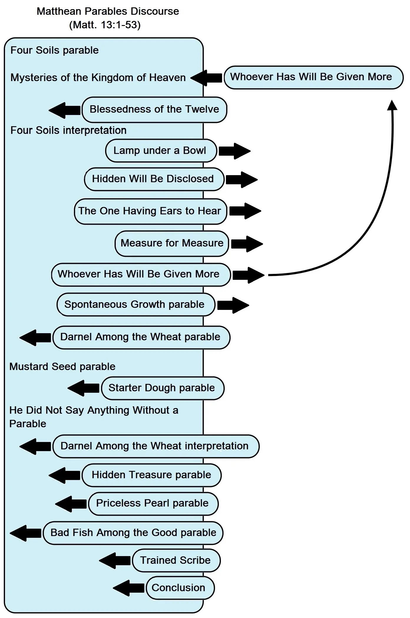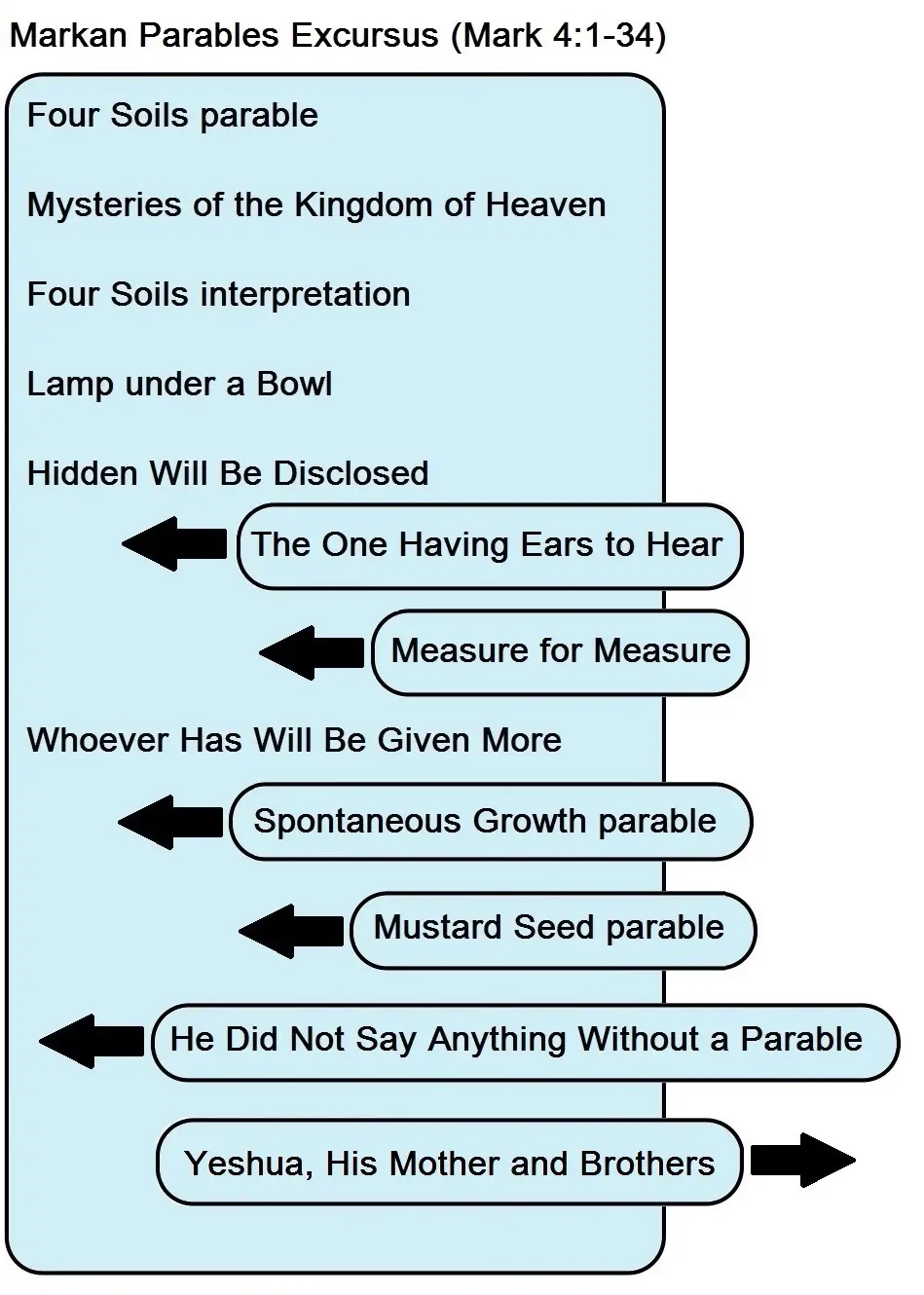 When the author of Mark read Luke’s Gospel he sensed the intrusiveness of the Mysteries of the Kingdom of Heaven saying, but rather than rearrange Luke’s pericope order he decided to modify the wording of the disciples’ question to better integrate Mysteries of the Kingdom of Heaven into its context. Thus, in Mark 4:10 those around Jesus no longer ask, “What is [the meaning of] this parable?”; instead they ask “[about] the parables.” This form of the question more naturally leads into a rationale for Jesus’ use of story-parables. In Matthew the disciples’ question has been shaped even further: “Why do you speak to them in parables?” (Matt. 13:10). This reformulation of the disciples’ question in the Synoptic Gospels is one of the clearest examples of transmission from Luke to Mark to Matthew.