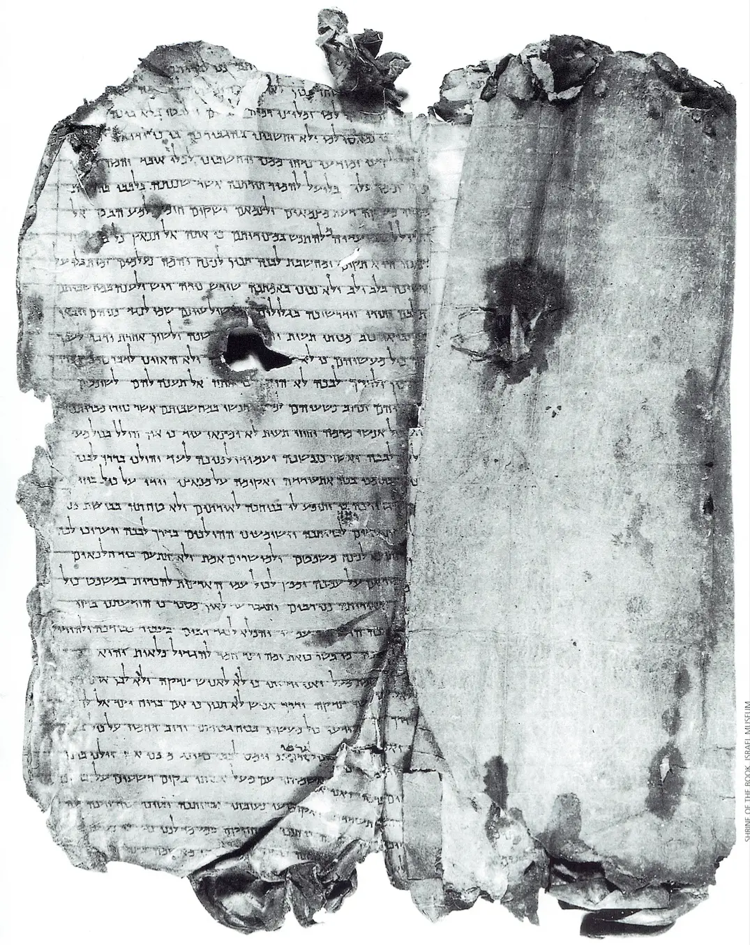 The Qumran scroll of Thanksgiving Hymns (1QHa) as it appeared at the beginning of its unrolling. Image courtesy of the Shrine of the Book, Israel Museum.