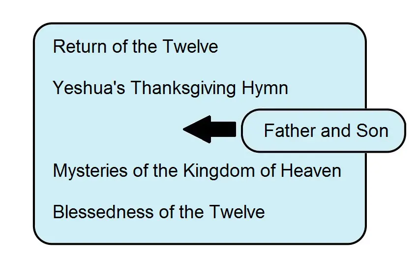 The Gospel of Luke reports the return of the Twelve in chapter 9, reflecting the version of “Success of the Twelve” he found in the First Reconstruction (FR), and the return of the Seventy-two in chapter 10, reflecting the version he found in the Anthology (Anth.). Anth.’s version preserved the complete account of Jesus’ enthusiastic response to the apostles’ report of their success. It appears, however, that the Anthologizer inserted an additional saying, Father and Son, following Yeshua’s Thanksgiving Hymn on account of shared themes and vocabulary. FR’s version merely reported the fact of the apostles’ return without recording Jesus’ response.