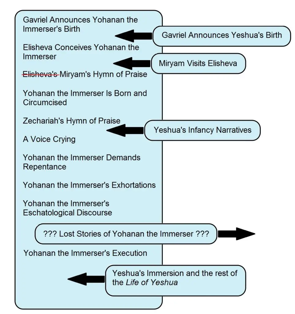 As we have stated elsewhere,[3] we believe that despite its extremely condensed and highly polished Greek form, Luke’s account of John’s imprisonment accurately preserves the placement of Yohanan the Immerser’s Execution as it appeared in the Anthology (Anth.) and in its predecessor, the Hebrew Life of Yeshua. It appears that the author of the Hebrew Life of Yeshua incorporated an earlier John the Baptist source, which we have dubbed the Hebrew Life of Yohanan the Immerser, into his biography of Jesus. This earlier source covered the full span of John the Baptist’s life, from the announcement of his birth to Zechariah and Elizabeth to his execution by Herod Antipas, but the Hebrew Life of Yohanan the Immerser made no reference to Jesus. When the author of the Hebrew Life of Yeshua incorporated this Baptistic source into his biography of Jesus, he decided to use up all the material from this source before describing any interactions between John the Baptist and Jesus, which, of necessity, the author of the Hebrew Life of Yeshua composed himself. Thus, in the Hebrew Life of Yeshua (and subsequently in Anth. and the Gospel of Luke, which retained the original pericopae order) John the Baptist’s execution was reported prior to the sole personal encounter between John and Jesus. Feeling the awkwardness of reporting the grizzly details of the Baptist’s death before the account of Jesus’ baptism, the author of Luke skimmed over the two narratives in such a way that he merely noted the fact of John’s imprisonment and described Jesus’ baptism without explicitly stating that John the Baptist was present for that momentous occasion. His editorial attempts to smooth over the jarring transition between Yohanan the Immerser’s Execution and Yeshua’s Immersion notwithstanding, the author of Luke preserved the pericope order of Anth. and, ultimately, of the Hebrew Life of Yeshua.