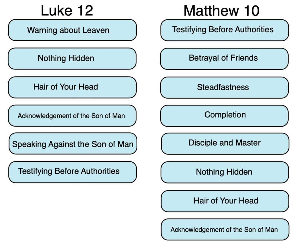 The Matthean version of Nothing Hidden (Matt. 10:26) and the non-“string of pearls” version in Luke (Luke 12:2) share the verbatim phrase ὃ οὐκ ἀποκαλυφθήσεται καὶ κρυπτὸν ὃ οὐ γνωσθήσεται (ho ouk apokalūfthēsetai kai krūpton ho ou gnōsthēsetai, “which will not be uncovered, and hidden which will not be made known”). This phrase does not occur in Luke 8:17, which does not even use the verb ἀποκαλύπτειν (apokalūptein, “to uncover”). Here again, the verbal identity points to a common source behind Matt. 10:26 and Luke 12:2. Moreover, these two versions of Nothing Hidden appear in a cluster of sayings that is similarly structured in Luke 12 and Matthew 10: