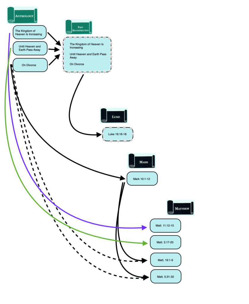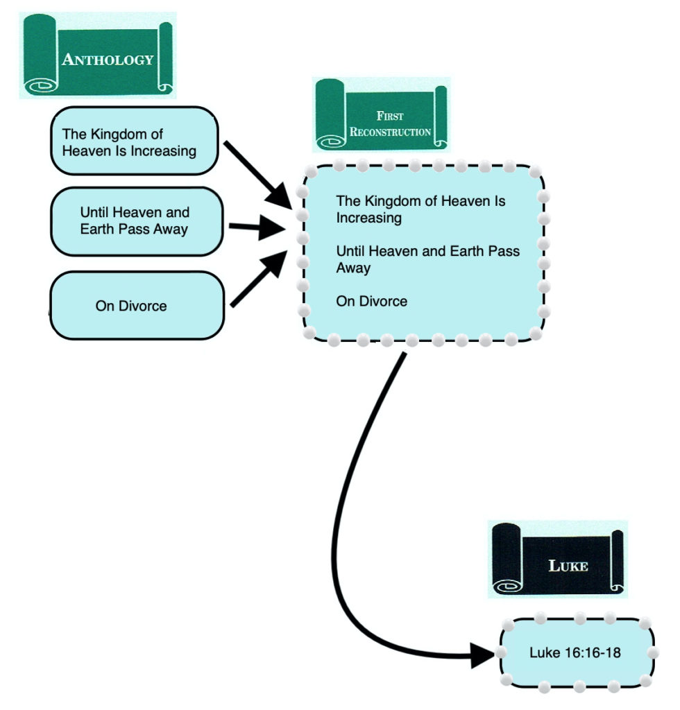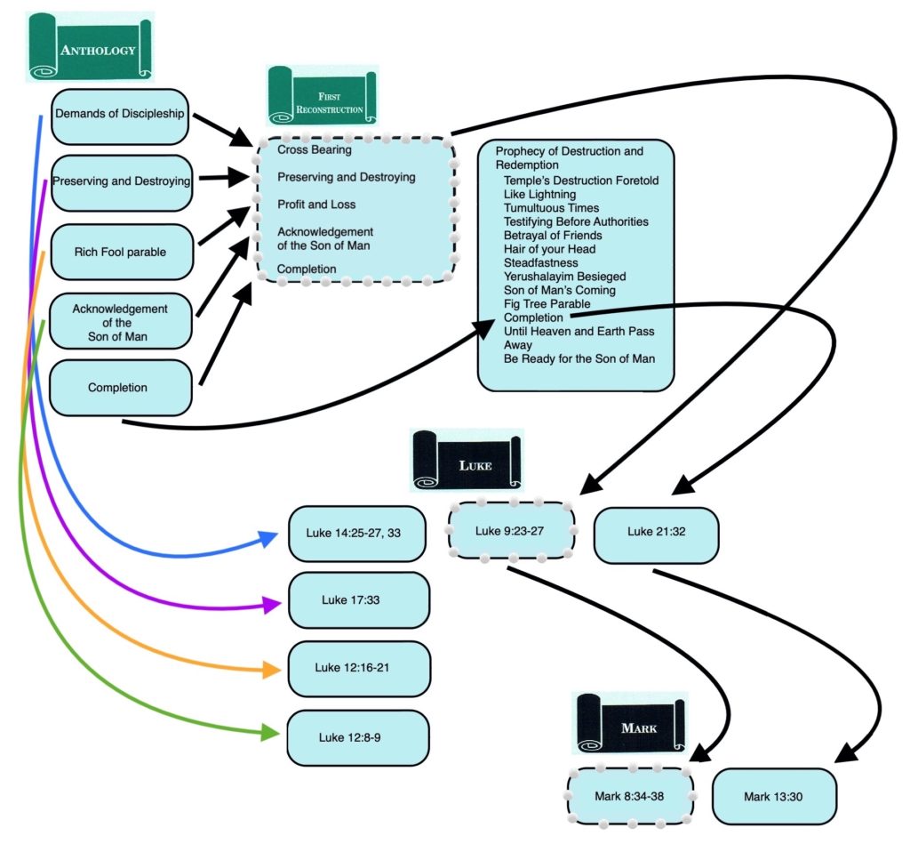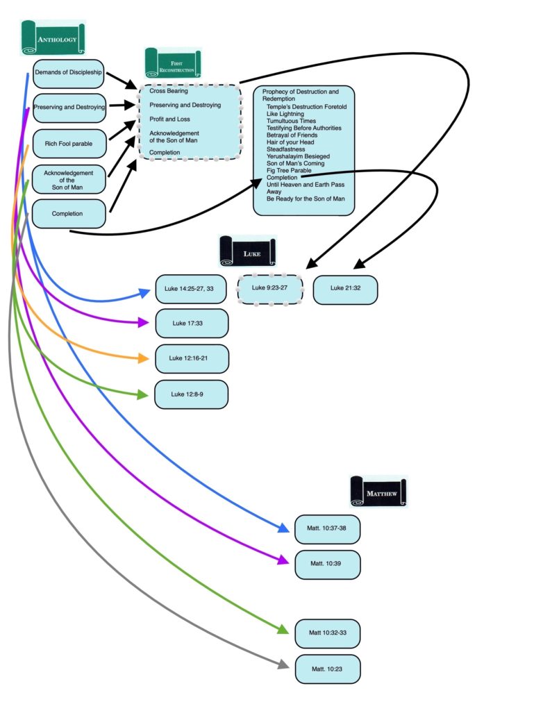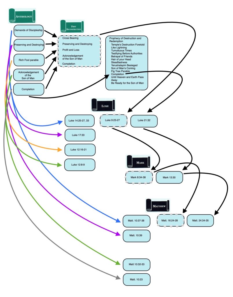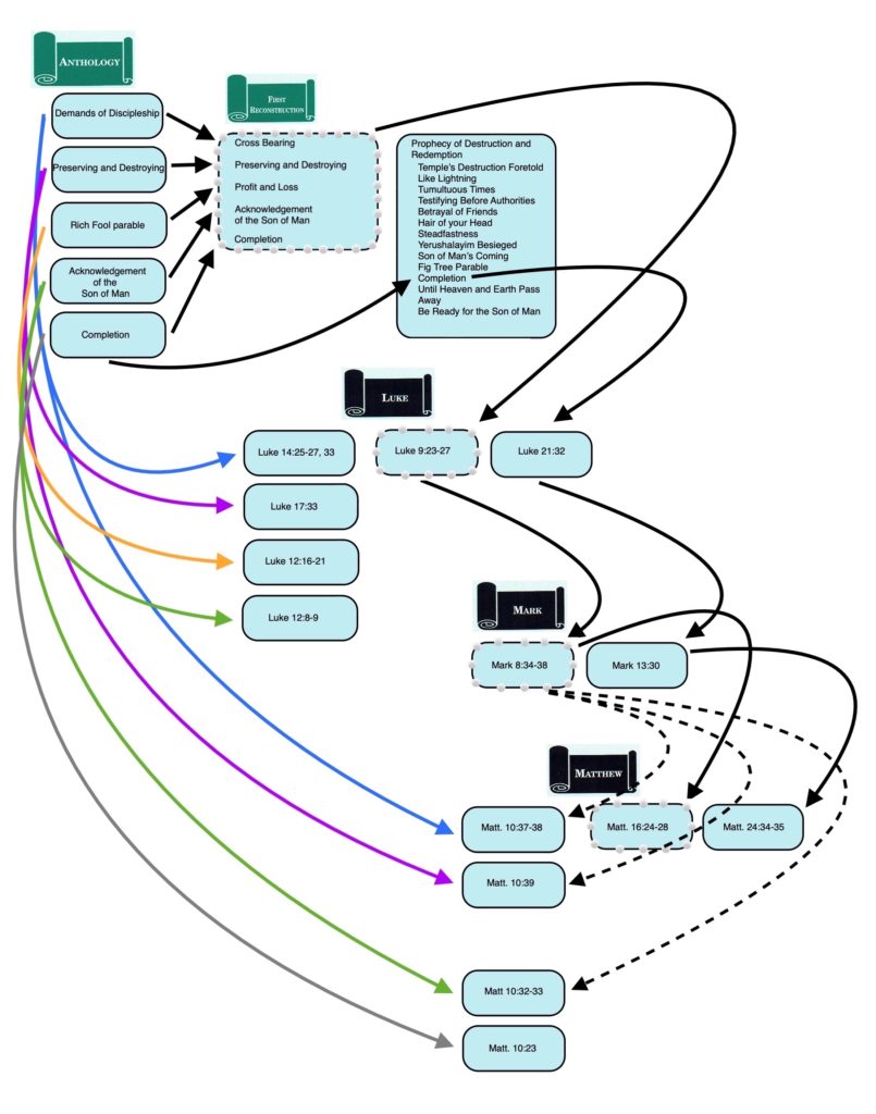 Since the author of Matthew adopted both the Markan “string of pearls” and most of the Anth. versions of these sayings, there are “Matthean Doublets” of Jesus’ Cross Bearing saying (Matt. 10:38; 16:24), Preserving and Destroying (Matt. 10:39; 16:25) and Acknowledgement of the Son of Man (Matt. 10:32-33; Matt. 16:27). Completion occurs as a “Matthean Triplet” because in addition to adopting the Anth. version of this saying (Matt. 10:23) and the “string of pearls” version (Matt. 16:28), the author of Matthew also included the version (Matt. 24:34-35) that the First Reconstructor had incorporated into Jesus’ prophecy of destruction and redemption and that had remained a part of Jesus’ prophecy in Luke and Mark.