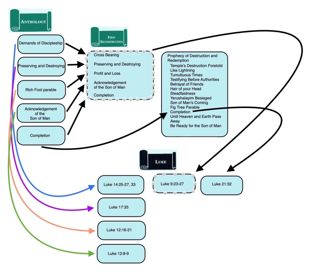 The same phenomenon occurs in the second “string of pearls” (Luke 9:23-27). The Anth. parallels to Luke 9:24 (Luke 17:33) and Luke 9:25 (Luke 12:20) share the key term ψυχή (psūchē, “soul,” “life”). It should also be noted that although the Anth. parallel to Luke 9:23 (Luke 14:27) does not contain the word ψυχή, this verse does occur in a pericope (Demands of Discipleship; Luke 14:25-27, 33) where the noun ψυχή features prominently (“If someone comes to me and does not hate…even his own soul, he cannot be my disciple”; Luke 14:26). Thus, the doublets of the sayings outside the “strings of pearls” show themselves to be more original by preserving the reason the sayings were first strung together. The more original versions are to be traced back to Anth., while the redacted versions are to be assigned to FR.