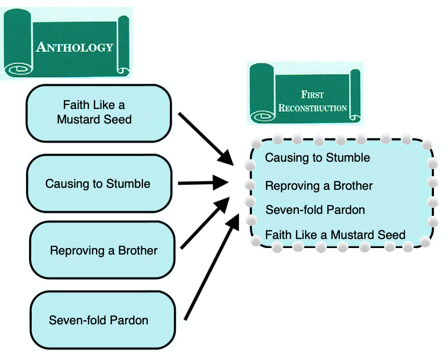 Lindsey noted that the sayings contained in two sets of the “strings of pearls” have doublets elsewhere in Luke’s Gospel. These doublets are usually embedded in a broader teaching context and are usually characterized by stylistically poorer Greek. According to Lindsey, the main reason doublets occur in Luke is the author of Luke’s use of two parallel and related sources: FR and the Anthology (Anth.).[3] Lindsey described FR as a stylistically improved Greek paraphrase of select Anth. pericopae, which the First Reconstructor attempted to arrange into something like a continuous narrative.[4] Since the sayings contained in the “strings of pearls” are of better quality Greek than their doublets elsewhere in Luke, it makes sense to attribute the versions collected in the “strings of pearls” to FR.