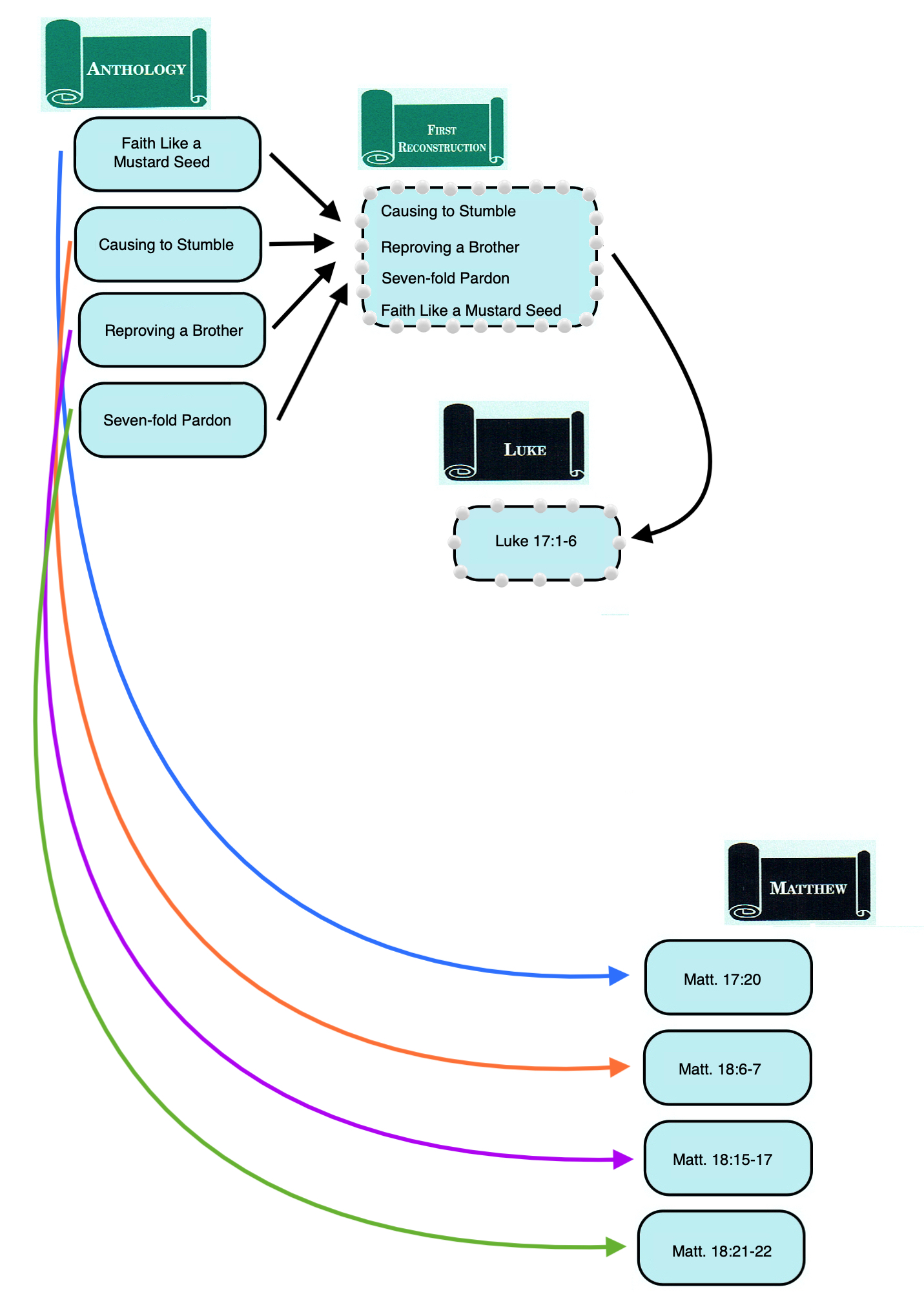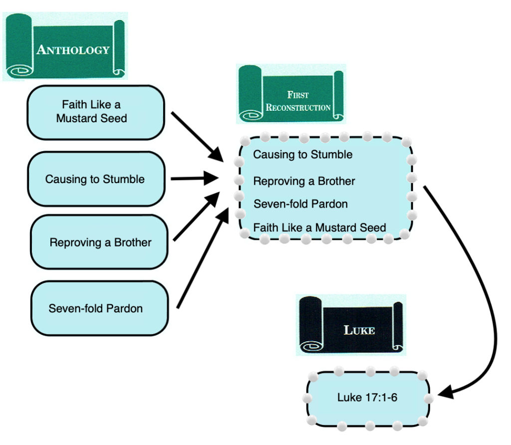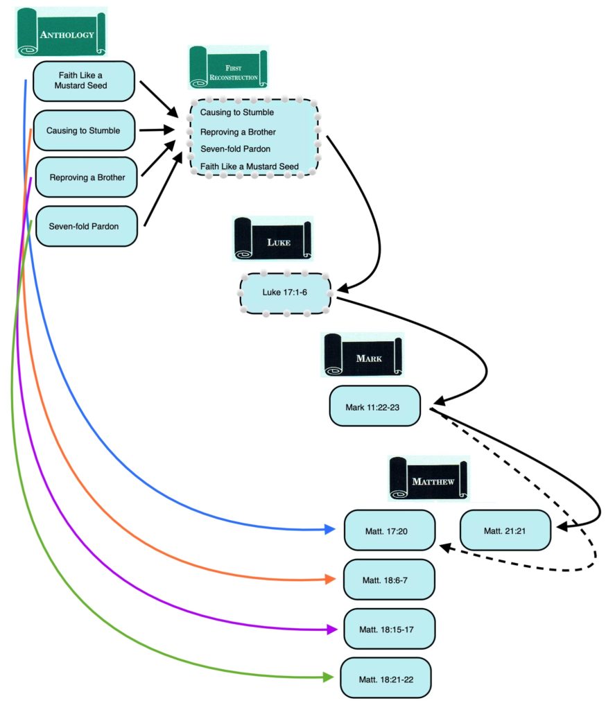 The First Reconstruction was the source of the four “strings of pearls” in Luke’s Gospel (Luke 8:16-18; 9:23-27; 16:16-18; 17:1-6). Mark’s Gospel adopted two “strings of pearls” from Luke (Luke 8:16-18 ∥ Mark 4:21-22, 25; Luke 9:23-27 ∥ Mark 8:34-9:1) and has a distorted reflection of a third (Luke 17:1-6 ≈ Mark 11:22-25). Matthew’s Gospel accepted only one of Mark’s “strings of pearls” (Matt. 16:24-28 ∥ Mark 8:34-9:1). Due to the author of Matthew’s technique of “cross pollination,” however, Mark’s version of Faith Like a Mustard Seed (Mark 11:22-23), which comes from a Lukan “string of pearls” (Luke 17:1-6), influenced the wording of the two versions of Faith Like a Mustard Seed in Matthew, the Anth. version in Matt. 17:20 and the Markan version in Matt. 21:21. Thus, the “strings of pearls” are one example of the outsized influence of the First Reconstruction upon the synoptic tradition. Of the three synoptic evangelists, the First Reconstruction was known only to the author of Luke, but versions of Jesus’ sayings derived from the First Reconstruction are found in all three Synoptic Gospels.