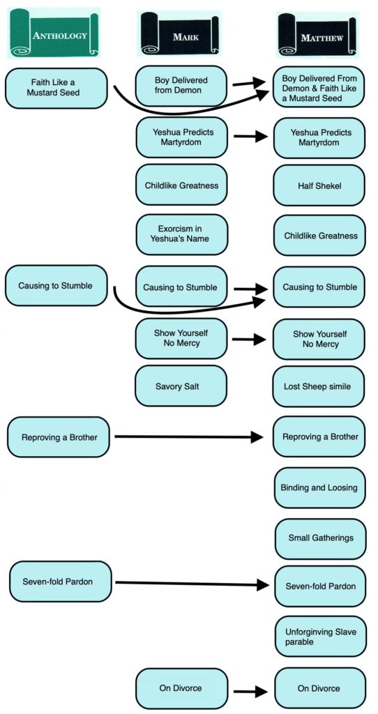 We have observed that Matthean Doublets suffer from a phenomenon we refer to as “cross-pollination.” In other words, when the author of Matthew encountered two versions of a saying in his sources, one in Mark and one in Anth., he allowed the wording of one version to influence the wording of the other, so that Matthean Doublets are rarely pristine.[23] Matthew’s Anth. version of a saying is frequently adulterated by the Markan version, and the Markan version is often tainted by the Anth. version. Sometimes a Matthean twist is given to both versions, though it was present in neither Mark nor Anth. The phenomenon of Matthean cross-pollination lessens the ability of Matthew to corroborate Luke’s versions of several “string of pearls” sayings against Mark’s.