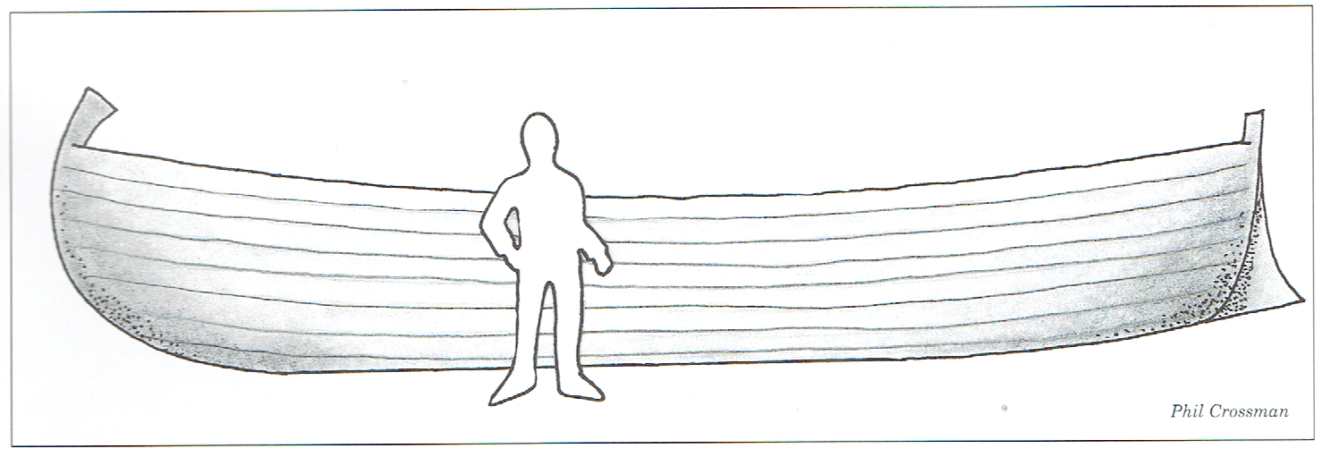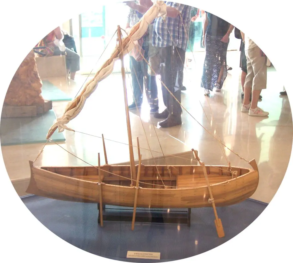 In 1986 a boat was discovered on the shore of the lake near Magdala that dates to the first century C.E. When the boat was still in use it had a mast and a sail, it measured about 29 feet long, 8 feet across, and 4 feet deep,[51] and was able to carry fifteen or more adults.[52] The boat, which had a deck in the stern, was typical of boats used by fishermen who fished with seine nets.[53] A boat such as this is probably what is referred to in Quieting a Storm.[54]