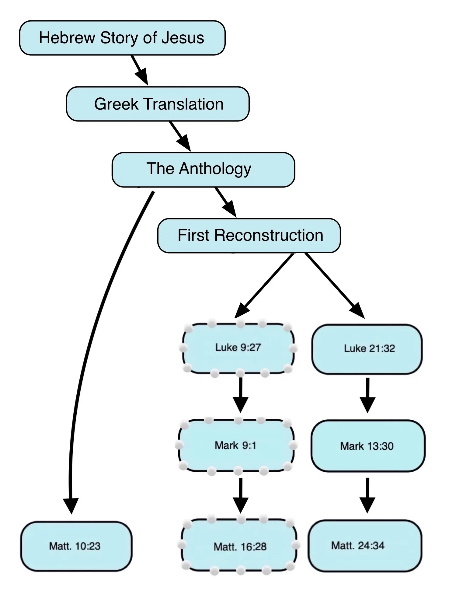 The evolution of the saying we have described correlates with the sources from which we believe each subdivision was originally taken. The version in Matt. 10:23 appears in a context where the author of Matthew drew heavily from the non-Markan source he shared with Luke, namely the Anthology (Anth.):