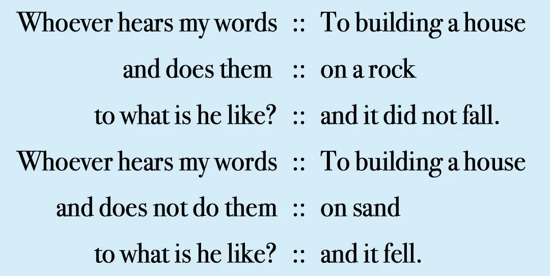 וְלָמָה אַתֶּם קֹרְאִים לִי אֲדוֹנִי אֲדוֹנִי וְאֵינְכֶם עֹשִׂים מַה שֶּׁאֲנִי אֹמֵר כָּל הַשּׁוֹמֵעַ אֶת דְּבָרַי וְעֹשֶׂה אֹתָם לְמַה הוּא דּוֹמֶה לְאָדָם שֶׁבָּנָה בַּיִת עַל הַסֶּלַע וְיָרְדוּ הַגְּשָׁמִים וְהָלְכוּ הַנְּחָלִים וְנָשְׁבוּ הָרוּחוֹת בְּאוֹתוֹ הַבַּיִת וְלֹא נָפַל שֶׁהָיָה בָּנוּי עַל הַסֶּלַע וְכָל הַשּׁוֹמֵעַ אֶת דְּבָרַי וְאֵינוֹ עֹשֶׂה אֹתָם לְמַה הוּא דּוֹמֶה לְאָדָם שֶׁבָּנָה בַּיִת עַל הַחוֹל וְיָרְדוּ הַגְּשָׁמִים וְהָלְכוּ הַנְּחָלִים וְנָשְׁבוּ הָרוּחוֹת בְּאוֹתוֹ הַבַּיִת וְנָפַל וְהָיְתָה נְפִילָתוֹ גְדוֹלָה