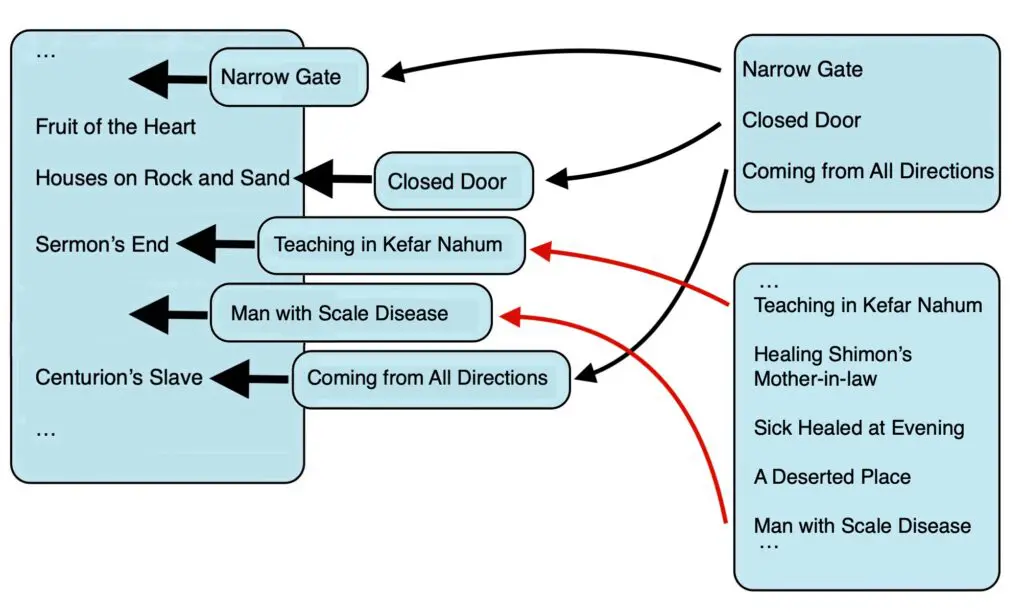The author of Matthew had been following the Markan order until the Sermon on the Mount. This sermon, however, occupies the same place in Matthew’s Gospel as Teaching in Kefar Nahum occupies in Mark,[11] and the author of Matthew inserted the people’s reaction to Jesus’ teaching from Mark’s version of Teaching in Kefar Nahum (Mark 1:22) into the conclusion of the Sermon on the Mount.[12] Having skipped the story of an exorcism that took place while Jesus was teaching in a synagogue, the author of Matthew did not resume Mark’s order until after Mark’s version of A Deserted Place, in which Mark mentions Jesus’ teaching in synagogues and driving out demons.[13] The author of Matthew then recorded Man with Scale Disease in its Markan sequence, but then slipped in Centurion’s Slave, a Double Tradition (DT) pericope, which in Luke is the sequel to the Sermon on the Plain. Thus, just as the author of Matthew wove Mark’s pericope order into the Sermon on the Mount and the pericopae thereafter, so the author of Matthew wove the unit preserved in Luke 13:22-30 into the Sermon on the Mount and the pericopae thereafter.[14] In thus weaving together Markan and DT material in and around the Sermon on the Mount, the author of Matthew treated his two sources, Mark and Anth., alike.
