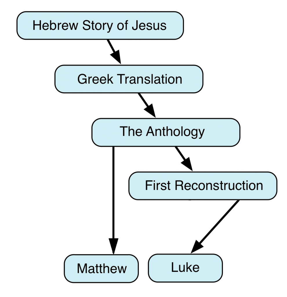 According to Lindsey, the reason Type 2 DT pericopae have low levels of verbal identity is that in these cases the authors of Luke and Matthew relied on two different sources.[19] The author of Matthew relied on the Anthology (Anth.), Matthew’s sole source for DT pericopae. The author of Luke, on the other hand, relied on the First Reconstruction (FR), a stylistically polished epitome of Anth. According to Lindsey, the First Reconstructor attempted to place the pericopae he selected from Anth. into a continuous narrative. As an epitomizer, the First Reconstructor would have shortened Narrow Gate and simplified its structure. And because he sought to create a continuous narrative out of Anth.’s fragments, the First Reconstructor would have provided Luke’s version of Narrow Gate with its narrative introduction. Matthew’s version of Narrow Gate would be more or less identical to Anth.’s.