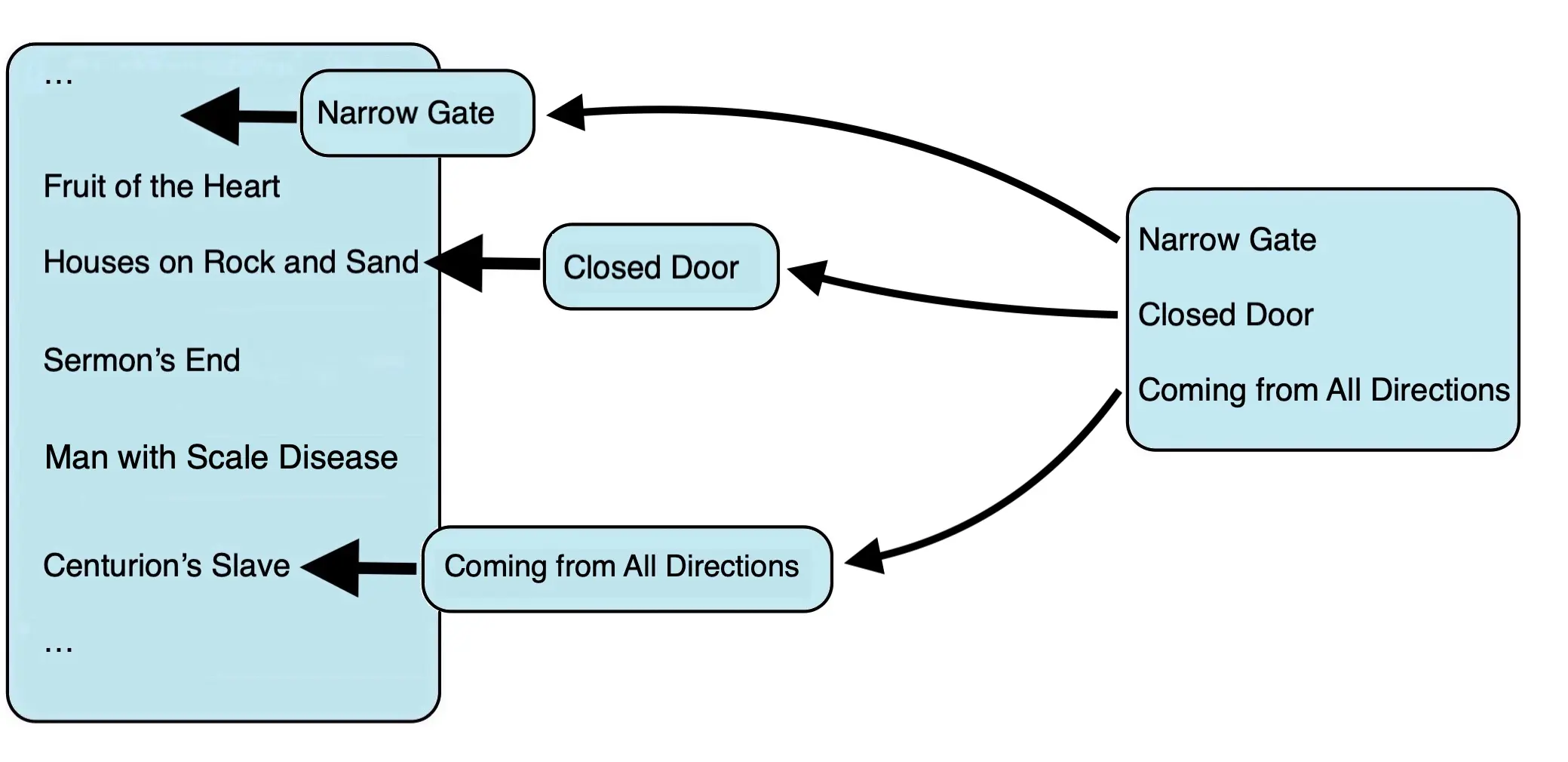 | Man With Edema ・ Open Invitation ・ Great Banquet parable ・ Closed Door ・ Coming From All Directions ・ Waiting Maidens parable |