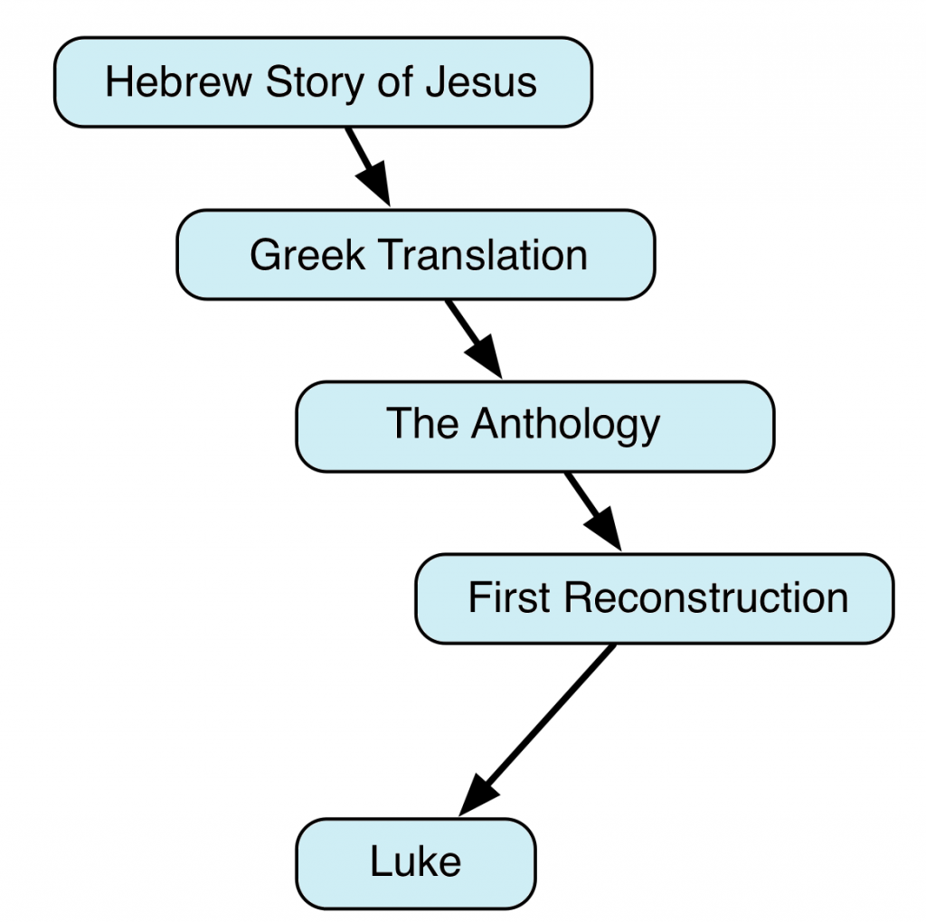Lindsey described Luke’s first source, the Anthology (Anth.), as a highly Hebraic source characterized by translation Greek, while he described Luke’s second source, the First Reconstruction (FR), as an epitome of Anth. with a more polished Greek style. Therefore, we do not expect to find many overt Hebraisms in pericopae the author of Luke copied from FR, and FR pericopae should put up a degree of resistance to retroversion to Hebrew, while the opposite should be true for pericopae copied from Anth. In addition, FR pericopae can be expected to include vocabulary typical of the First Reconstructor’s writing style. While the absence of such distinctive vocabulary cannot prove that a pericope did not come from FR, the presence of such distinctive vocabulary is a fairly reliable indicator that FR was its source.