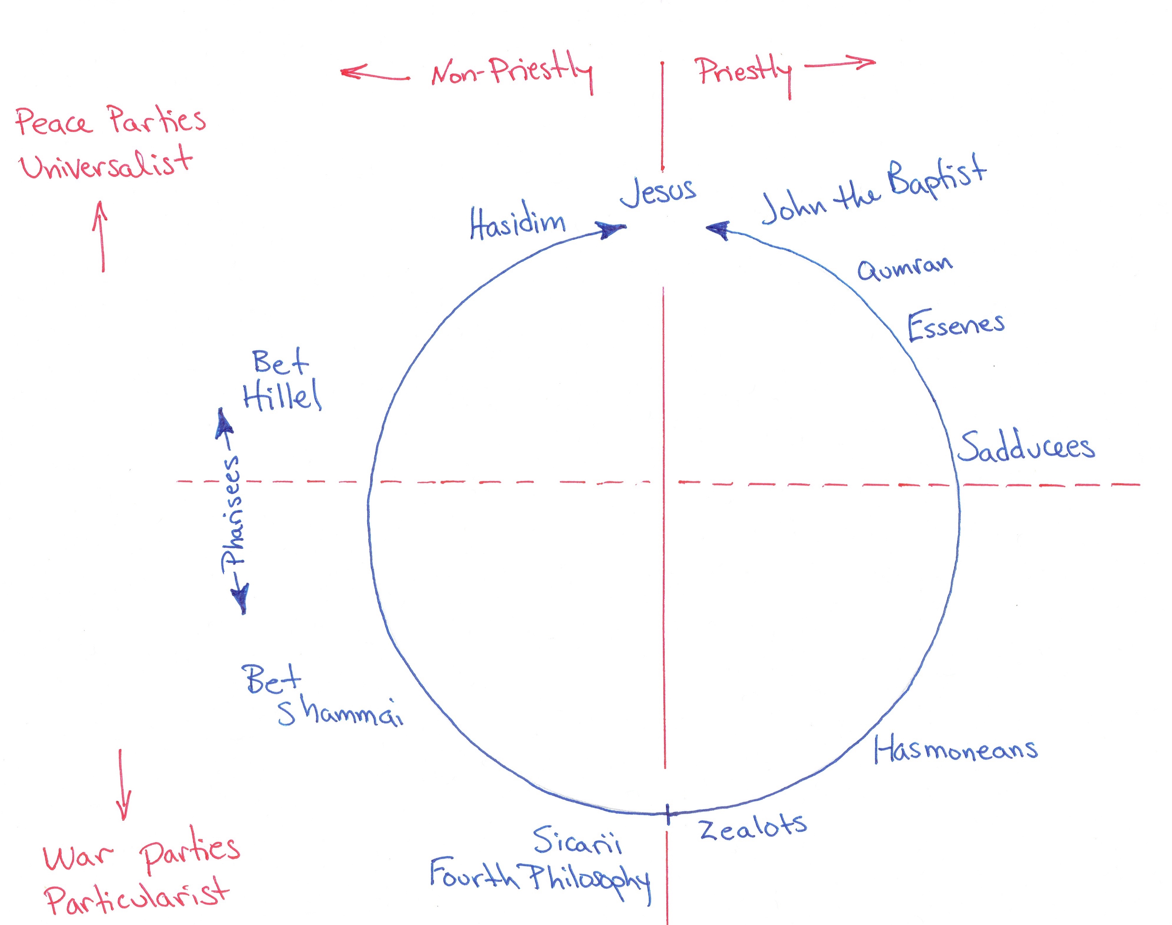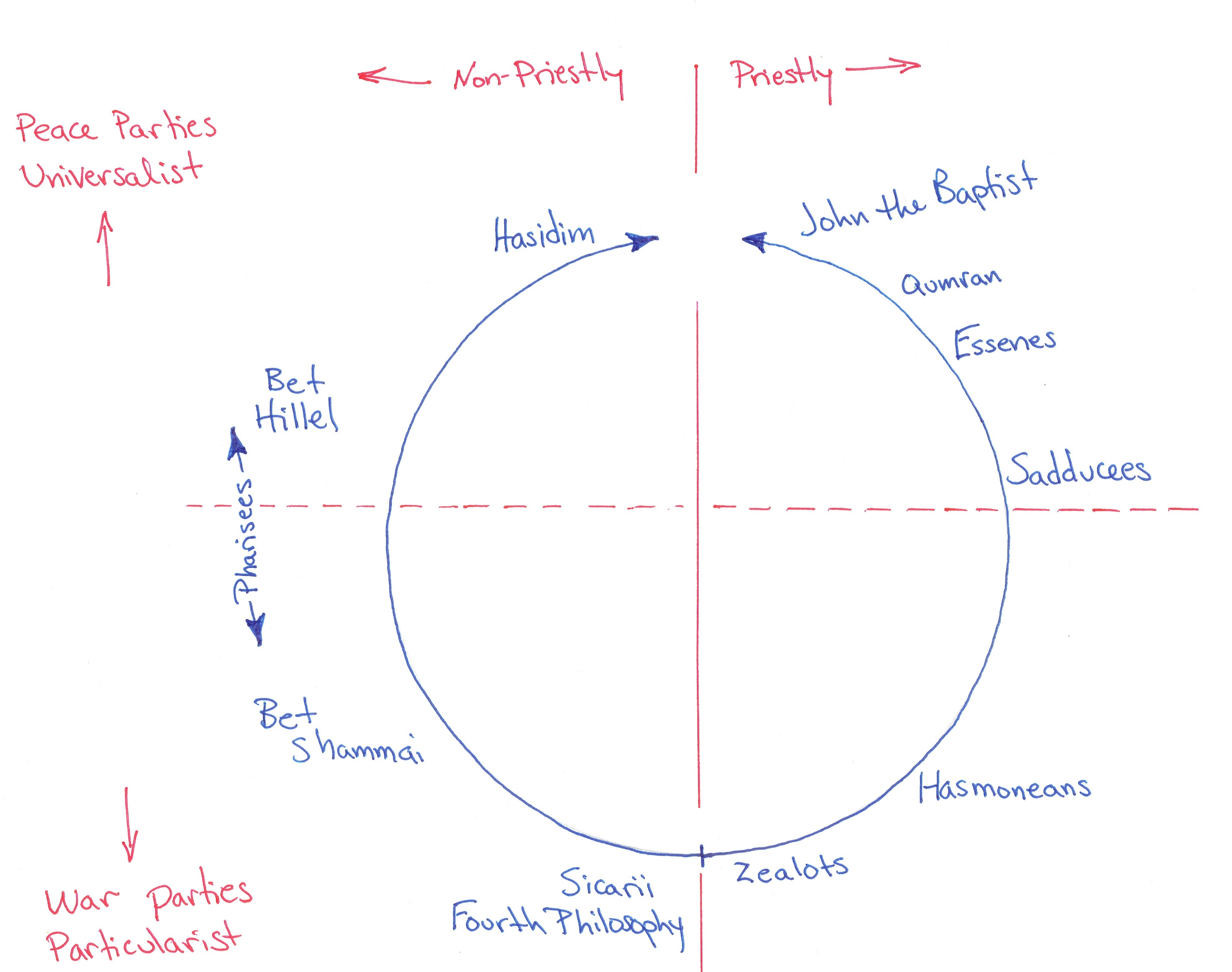 In the Second Temple period the Pharisees were divided into two main factions, the School of Hillel and the School of Shammai. The School of Hillel was known for its lenient rulings, its tolerance for diverse opinions, and its relative openness toward non-Jews. The School of Shammai, on the other hand, was generally more strict in its rulings, less imaginative in its approach, and known for its suspicion of non-Jews. In other words, the School of Shammai was more conservative in its ideological-religious expression than the School of Hillel.[13] I have therefore placed the School of Hillel farther to the left end of the spectrum than the School of Shammai: