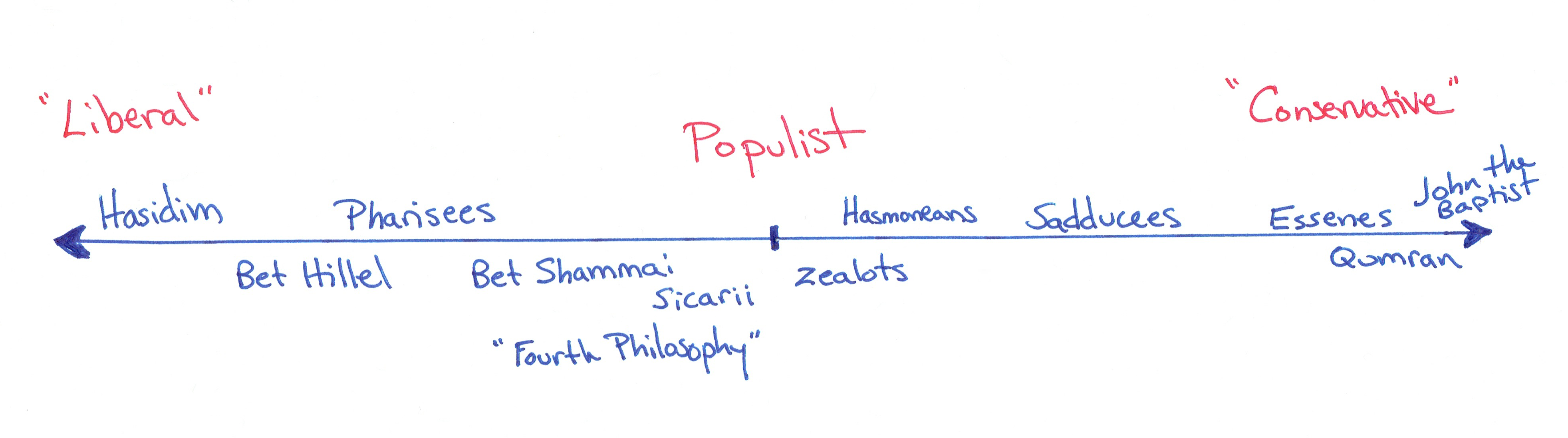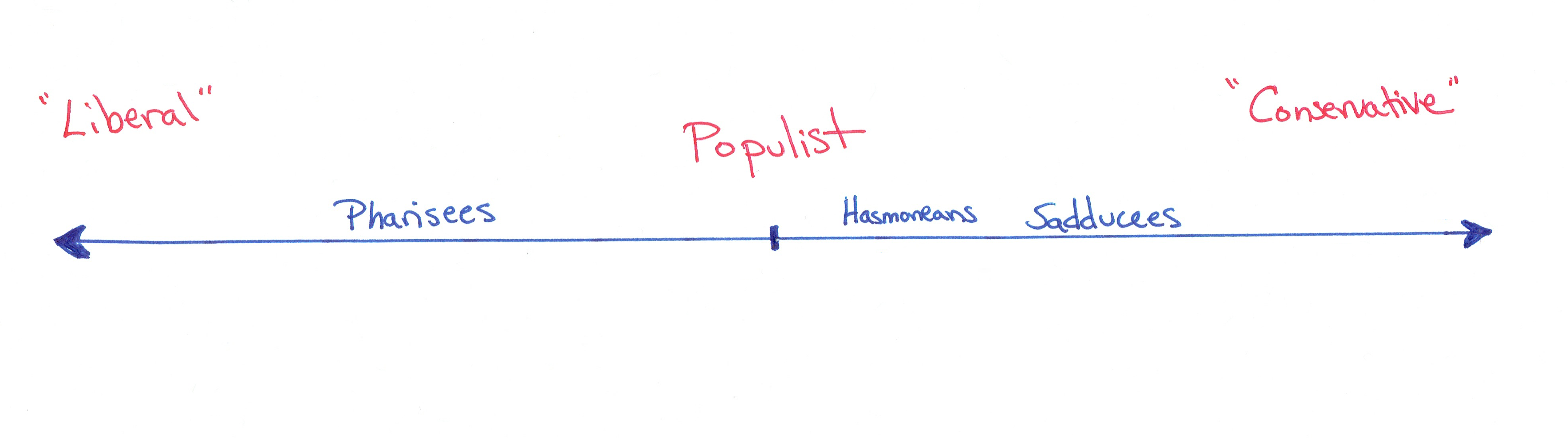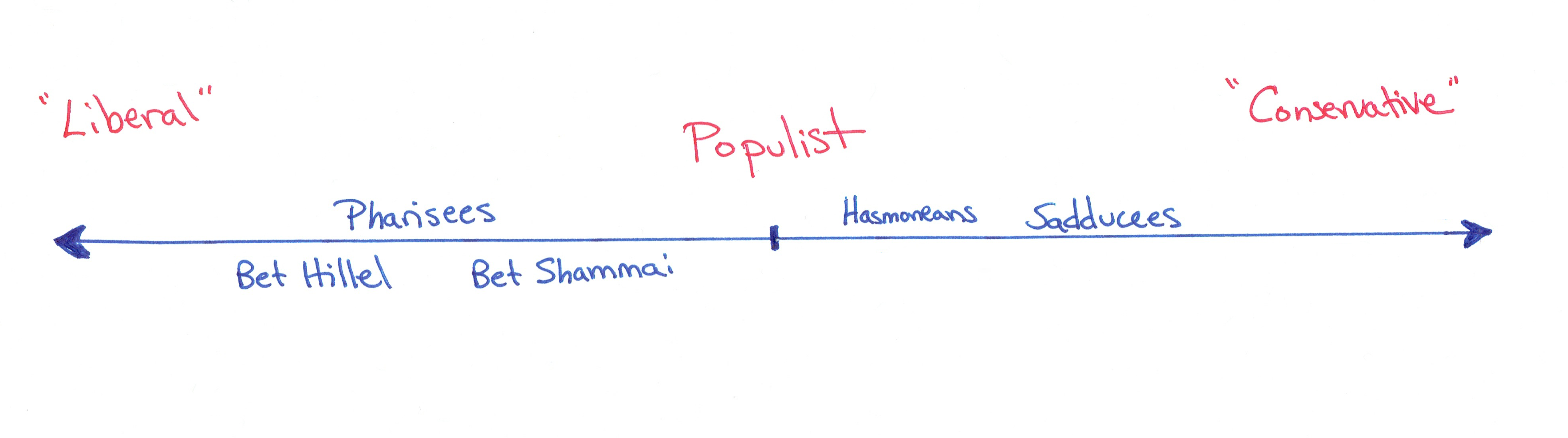 Now, the qualities we have observed as characteristic of the Sadducees—emphasis on lineage, protecting the privilege of an elite class, rejecting religious innovation, realist approach to halakhic reasoning—are what most people would call “conservative,” while the characteristics of the Pharisees—preference for merit over lineage, their advocacy for the democratization of access to the holy, their relative openness to religious innovation, and their nominalist approach to halakhah—are those that are traditionally identified as “liberal.” We will begin constructing our model of the ideological spectrum of Jesus’ time thus: