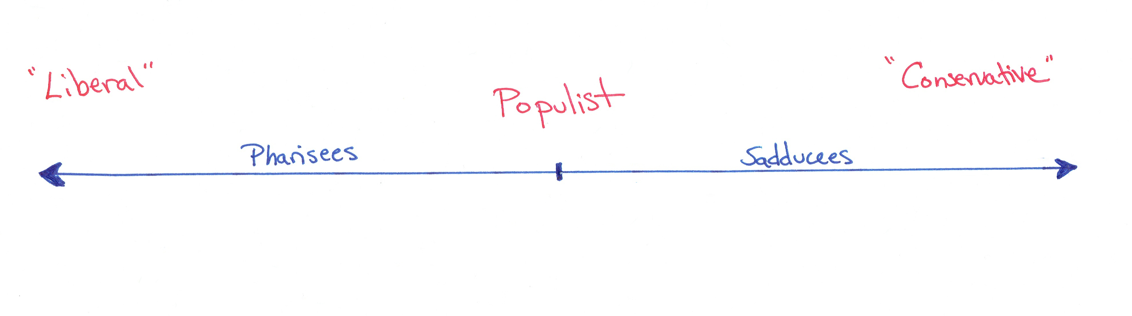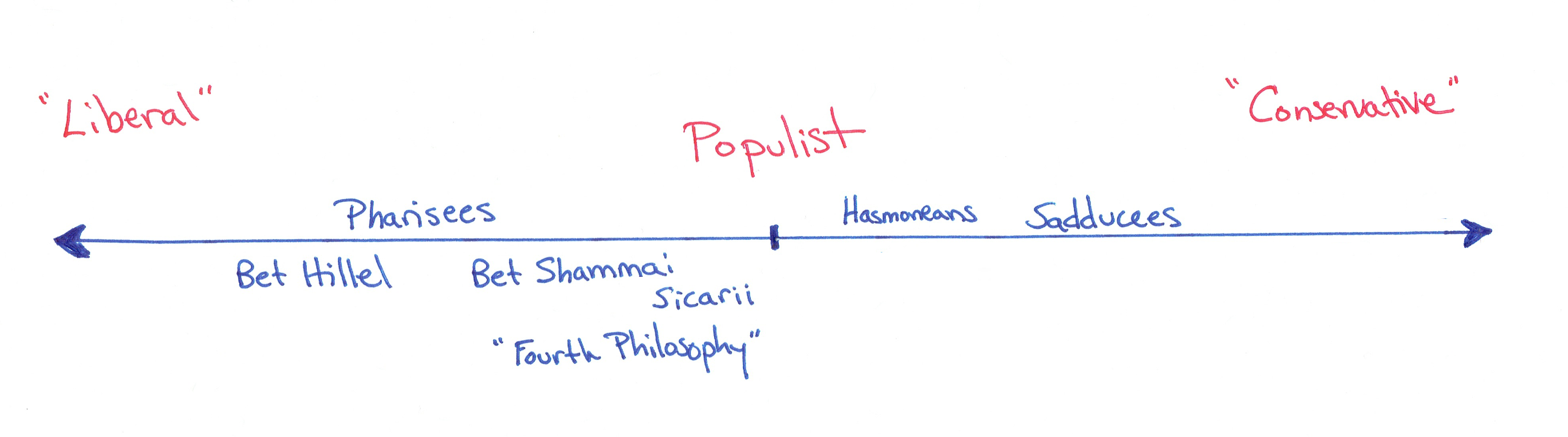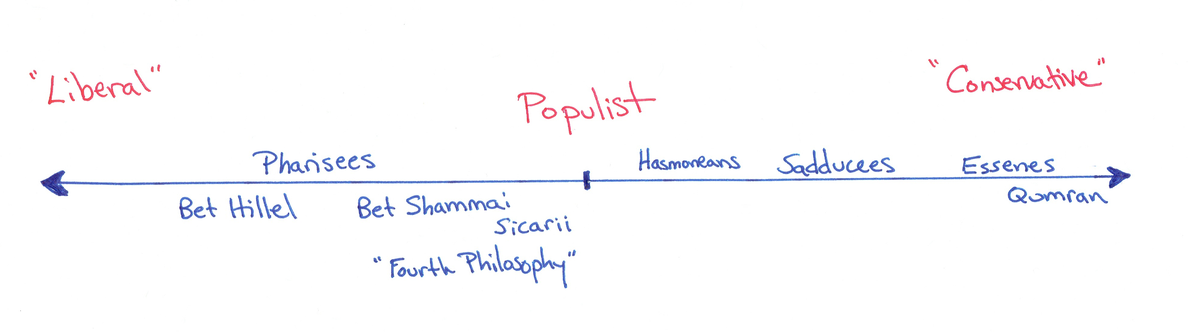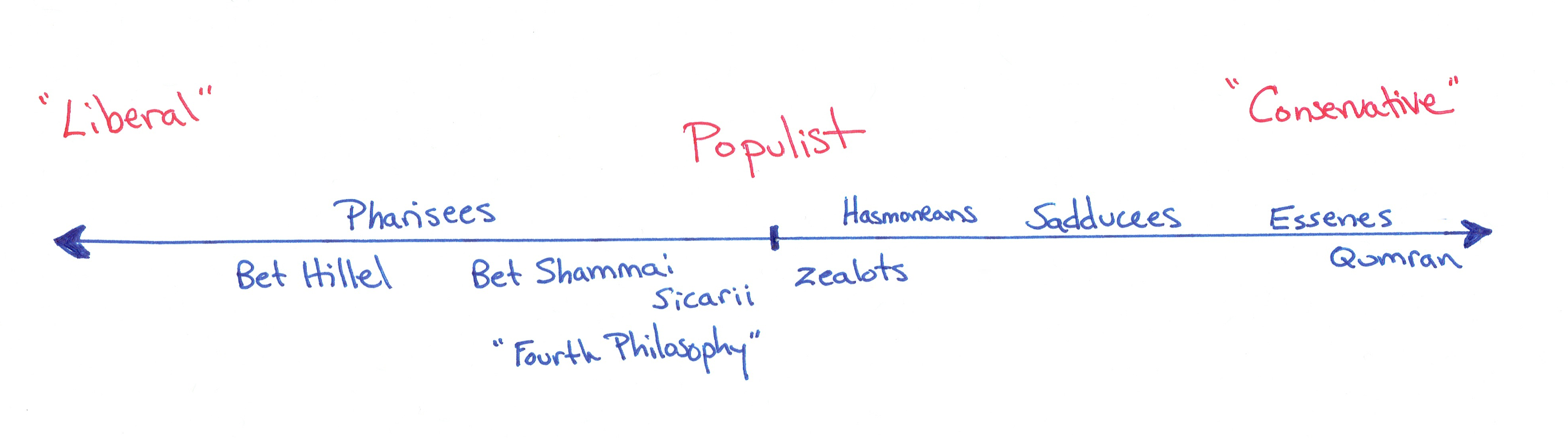 Now, the qualities we have observed as characteristic of the Sadducees—emphasis on lineage, protecting the privilege of an elite class, rejecting religious innovation, realist approach to halakhic reasoning—are what most people would call “conservative,” while the characteristics of the Pharisees—preference for merit over lineage, their advocacy for the democratization of access to the holy, their relative openness to religious innovation, and their nominalist approach to halakhah—are those that are traditionally identified as “liberal.” We will begin constructing our model of the ideological spectrum of Jesus’ time thus: