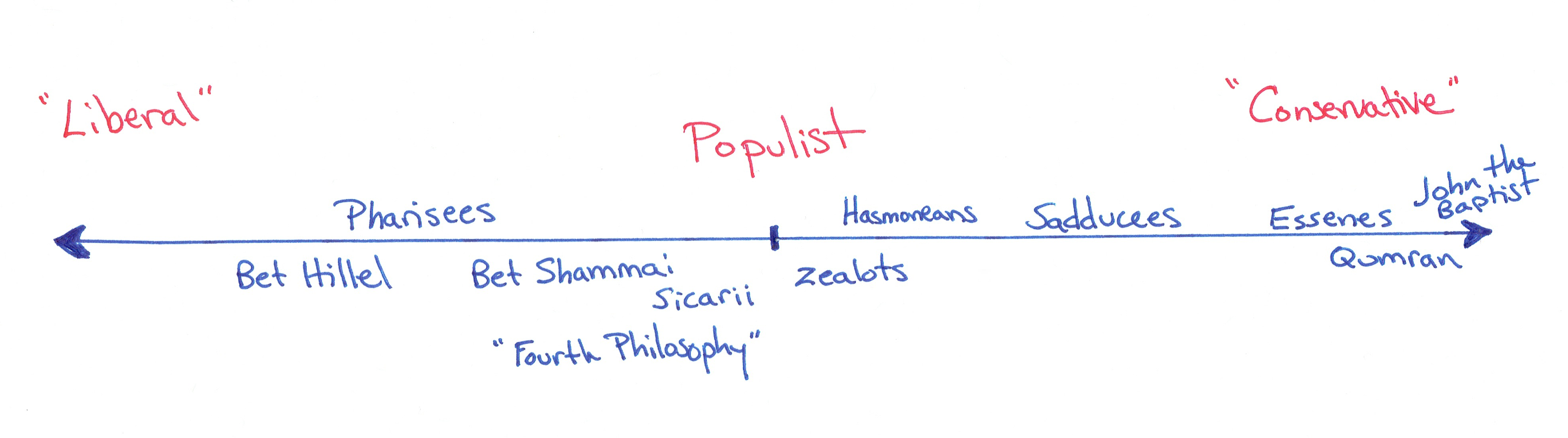 Since the Essenes were even more stringent than the Sadducees, and because they rejected the populist nationalist center, I have placed them to the right of the Sadducees on the spectrum with the Qumran Essenes on the far right end: