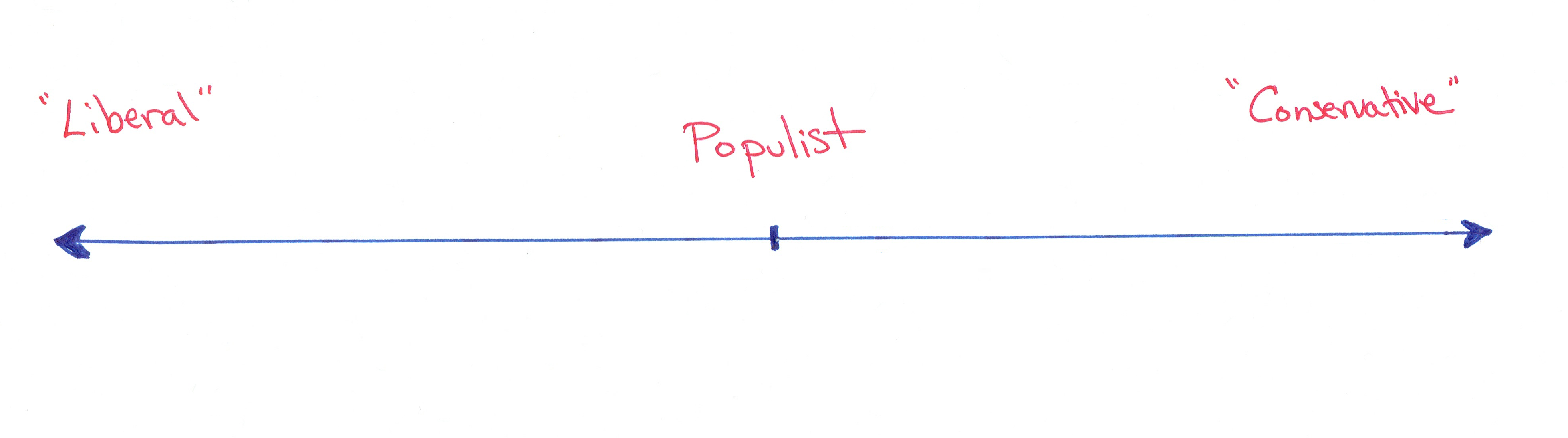 We will begin tackling our problem by accepting, at least provisionally, the common dichotomy between conservative and liberal approaches. According to convention, conservatives are placed on the right side of the ideological spectrum, while liberals are placed on the left, like this: