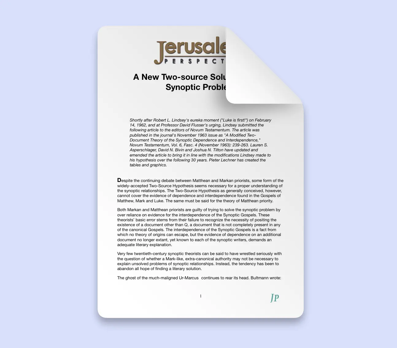 Nine articles (pdf format) by Robert L. Lindsey in which he defends his synoptic hypothesis.